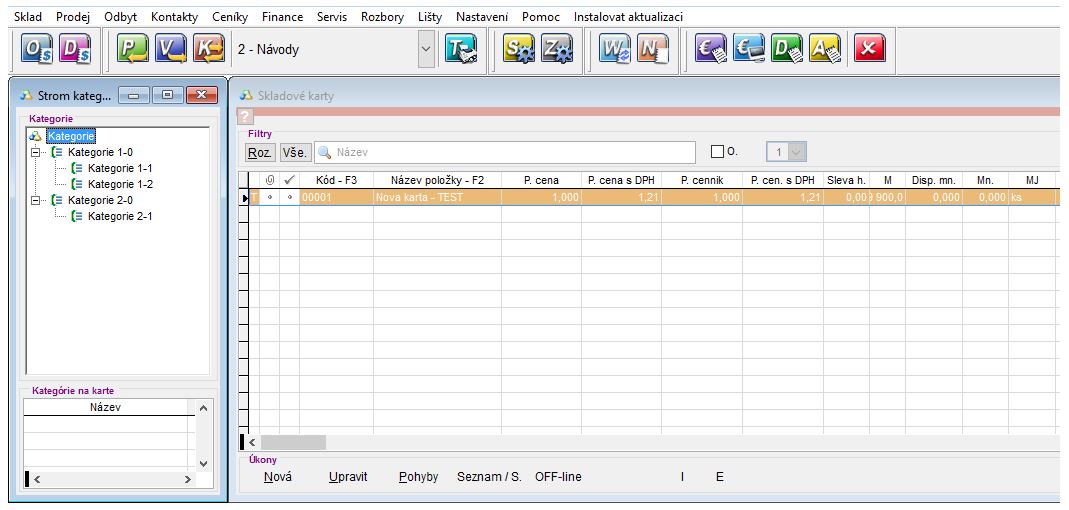 - Následně se zobrazí v levé části obrazovky okno se seznamem skladových kategorií nadefinovaných v aplikaci. (Podle potřeby je možné si okno s kategoriemi nebo seznamem karet roztáhnout, případně posunout tak, aby byla okna v seznamu u sebe.)