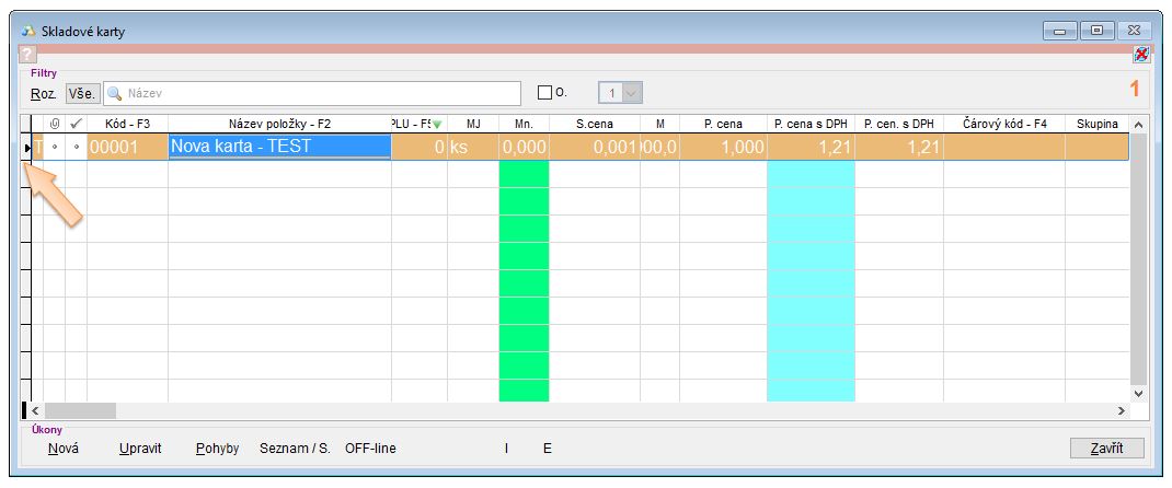 - Otevřete si seznam skladových karet kliknutím na ikonu K na nástrojové liště aplikace.