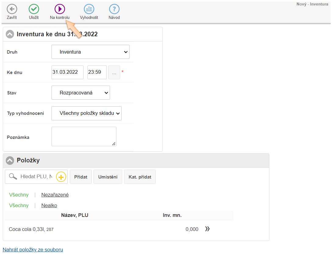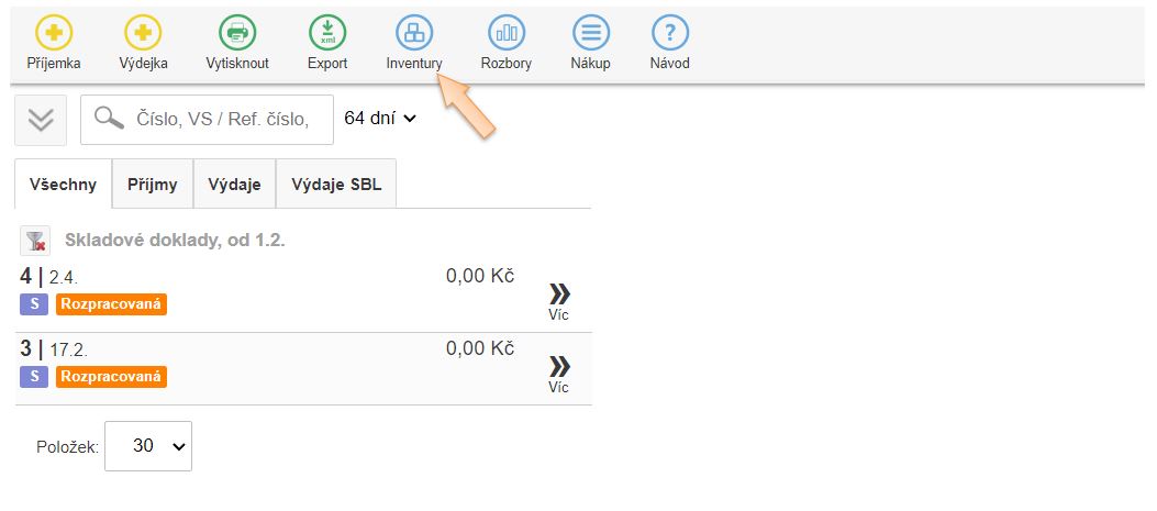 Systém na pozadí automaticky činí inventurní příjem, resp. pokud byl na položkách nějaký stav, udělá výdej, aby po vypořádání byl stav na kartách 0. Po nahození dokladů od dodavatelů do systému, doporučujeme provést inventuru se skutečným počtem skladových zásob.