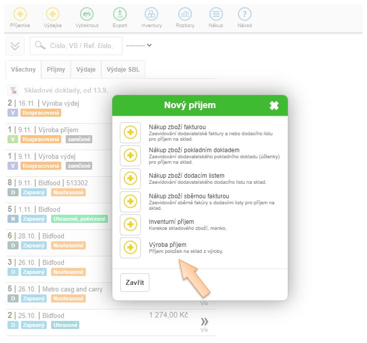 2. Kliknutím na + Příjem vytvoříte skladový výdej.