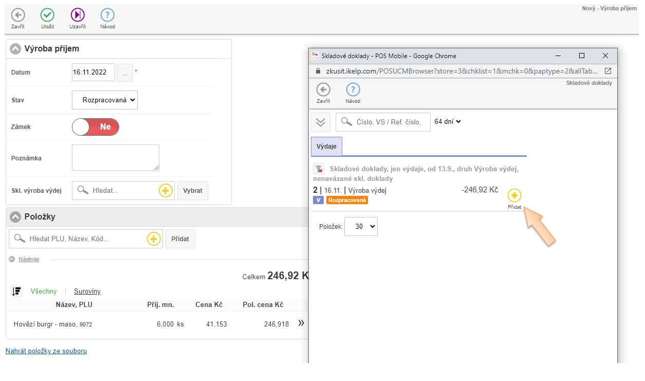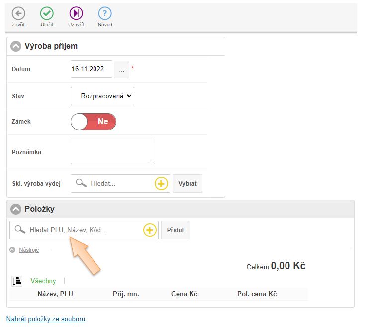 4. Vložte položky do dokladu, které vznikají výrobou, zadejte množství a skladovou cenu.