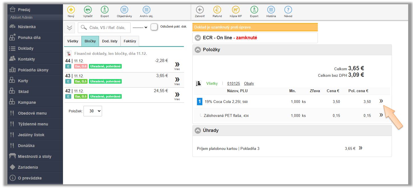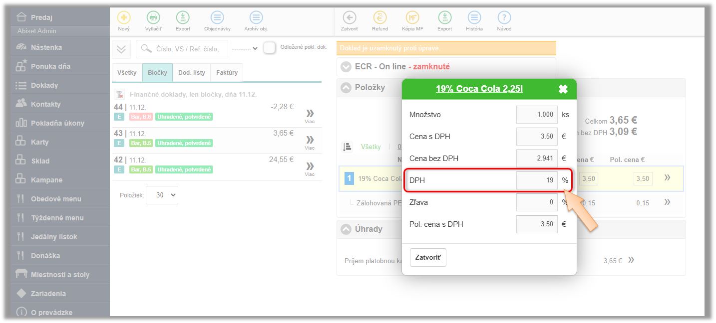 - Po kliknutí na Viac pri jednotlivých položkách sa zobrazí detail položky dokladu, kde je vidieť aj výšku DPH.
