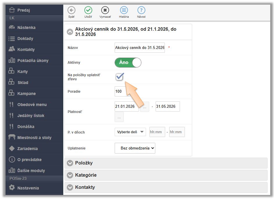 - Aktivujte možnosť Na položky uplatniť zľavu.