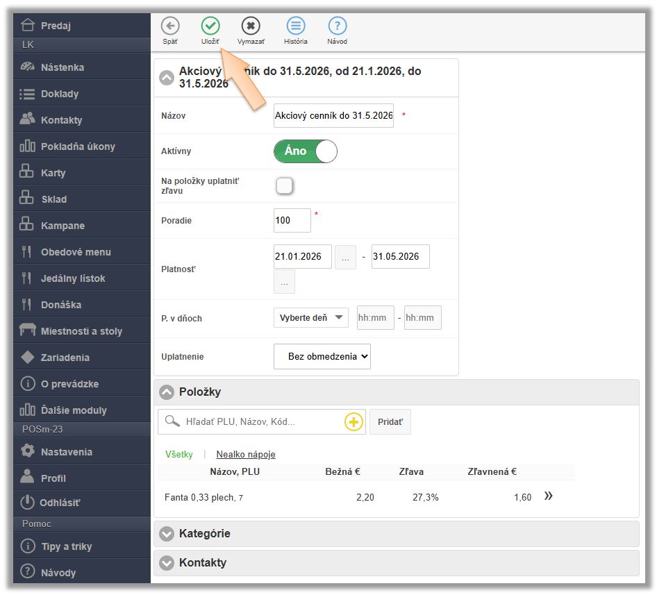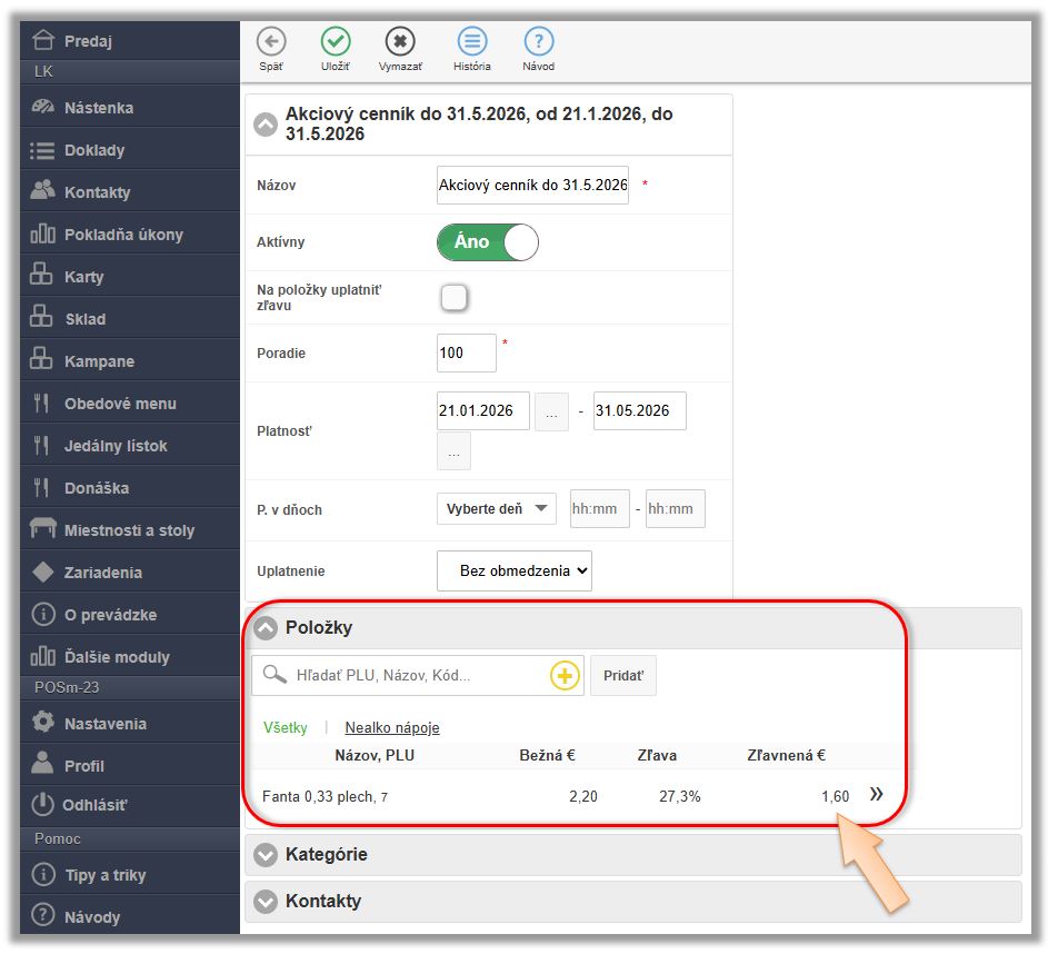- Kontakt - výber kontaktu, pre ktorý je cenník definovaný.