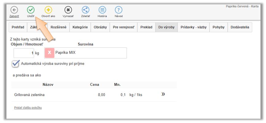 - Nastavte, že z 1kg tejto karty vzniká surovina. (V našom prípade Paprika MIX.)
