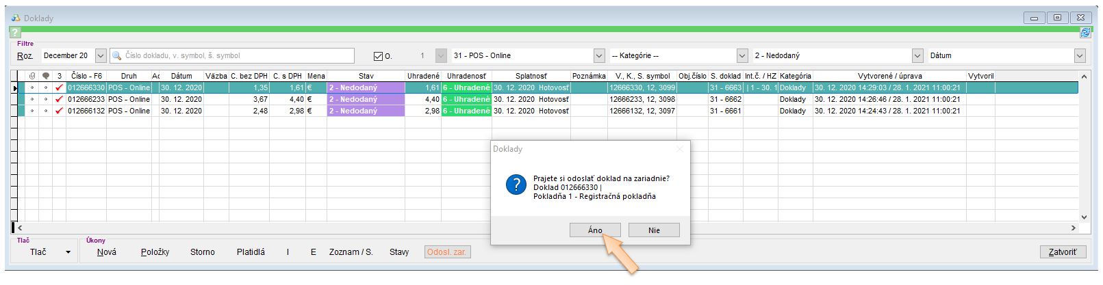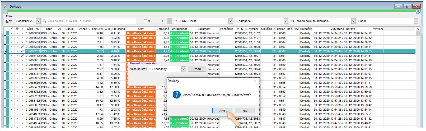 3. Zmente stav dokladov z 10 - eKasa čaká na odoslanie na 2 - Nedodaný.