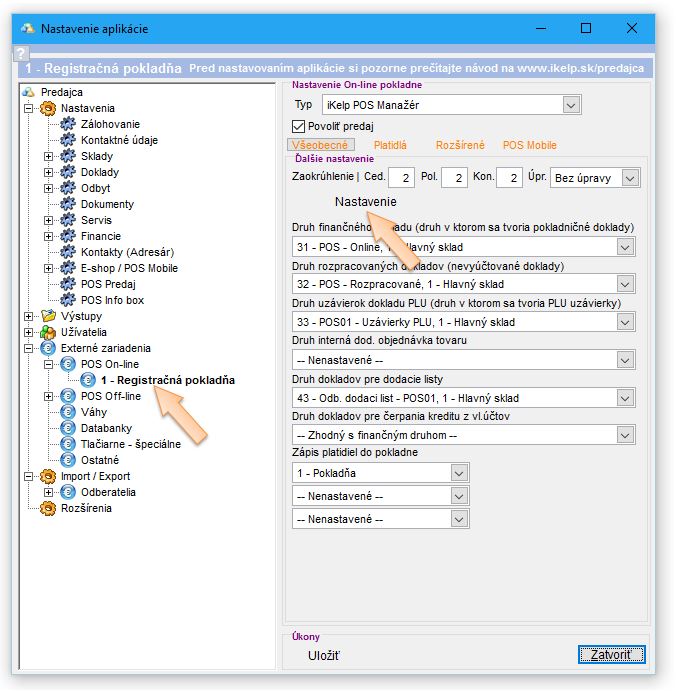 - Konfiguráciu aplikácie iKelp POS Manažér zobrazíte v menu aplikácie iKelp Predajca kliknutím na tlačidlo Nastavenia -> Nastavenia -> Externé zariadenia -> POS Online.