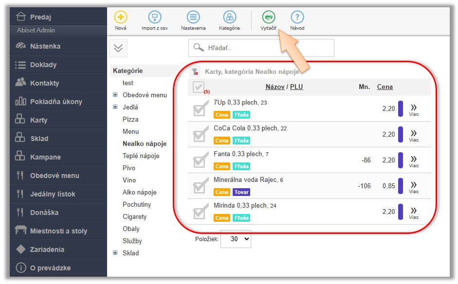 - Nastavte si požadované parametre pre tlač. (Napr. výberom ceny na cenovke Základná/Cenníková/Rozvoz.)
