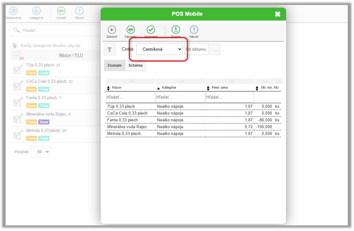 Pri tlači cenovky je možné definovať, či chcete cenovku tlačiť s bežnou predajnou cenou, alebo či chcete tlačiť cenníkovú, akciovú cenu a zobrazovať aj bežnú predajnú cenu ako prečiarknutú. Ak sa na cenovke má zobrazovať bežná predajná, aj akciová cena, je možné to nastaviť pomocou cenníkov v aplikácii.