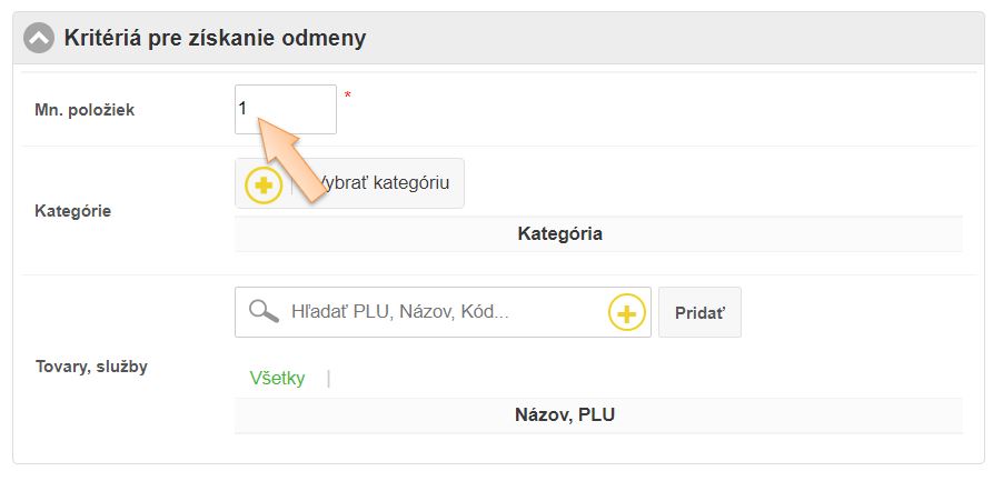 - Do poľa Mn. položiek zadajte počet položiek, ktoré musia byť v objednávke pre získanie odmeny. V našom prípade to môže byť aj 1.